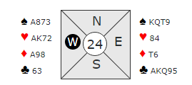 Ved mange bord startet det med 1 grand fra vest (15-17). Øst har 14 poeng, og det er litt i minste laget for slem, for de har maksimalt 31 poeng til sammen. Men østs hånd er god, ikke noen hvilken som helst 14 poenger. Og det er jo slik at bridgespill avgjøres ikke av antall HP, men antall stikk!