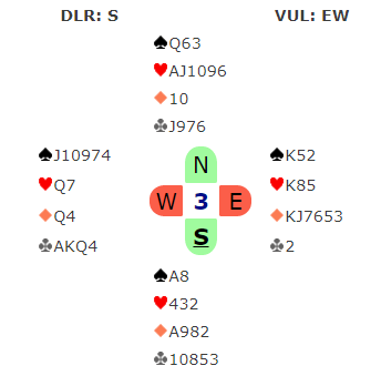 Jeg stusset litt på dette spillet, hvor de internasjonale toppspillerne Joe Grue (syd) og Sandra Rimstedt (nord) bommet på et motspill som ingen andre andre problemer med. Det var Gunn Tove Vist som var den heldige (vest), og hun hadde sammen med makker Christian Bakke havnet i 4 spar som de aller fleste andre Ø/V-parene.