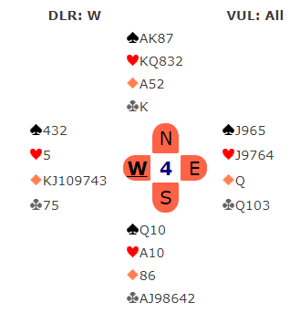 Wow, litt av en spilleføring dette, men på en måte logisk når en tar i betraktning at vest må ha lang ruter og en fordelingshånd. Likevel er det temmelig sjeldent. I to farger hvor spillefører rår over A-K-Q tar han finesse på direkten med tieren! Det måtte til for å vinne 6 hjerter som ser nokså håpløs ut med den skjeve sitsen.