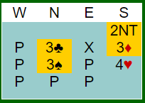 Bjørn Brovold åpnet med 1 hjerter, pass fra undertegnede og Hans Petter Brynildsen (V) men så slo Arne Marthinussen til med budet 4 spar. Etter to ganger pass kom så Vest på banen igjen ved å melde 5 ruter og så fulgte pass fra Arne og Bjørn. Hva ville du nå gjort som Syd?