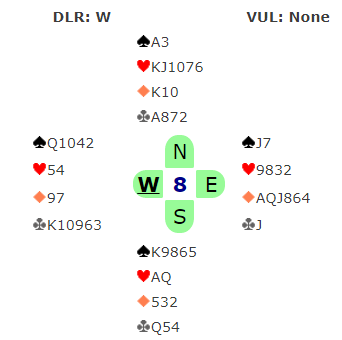Meldingene avslører jo mye, Vest må sikkert ha ru K med mange følgere men passet på 1 hjerter. Ø-V har til sammen 18 hp med mesteparten av dem i Øst. Problemet er jo at utspillet reiser tre stikk til dem og det må om mulig unngås. Du aner vel tegningen?