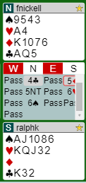 Meldingene er etter såkalt "kløverføringer" hvor 1 ruter viste hjerter (4+), og østs 1 hjerter trekorts hjerter. 2 kløver ba om 2 ruter (enten for å spille der eller invitere til utgang), men øst brøt "kravet" om å si 2 ruter med meldingen 2 spar fordi hun var så sterk. Da vest kunne melde utgang og har da den typiske invitthånden (til utgang) med femkorts hjerter tok øst kommandoen og tok dem til 6 hjerter via Key-Card 4NT hvor svaret viste at de ikke manglet noe nøkkelkort bortsett fra trumfdamen.