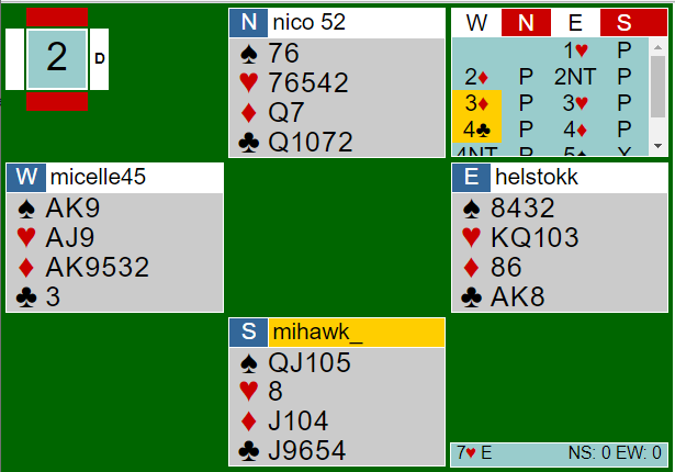 Her et spill fra Magne O sin Norsk på Norsk turnering på BBO søndag kveld forrige uke. Du er Syd og er spillefører i 7 spar med ruter 2 ut fra Vest. Det der jo veldig lett ut men du ergrer det kanskje for ikke å ha valgt 7 NT som kontrakt, for der er det bare å bla opp 13 stikk.