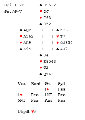Vel halvparten av de 50 Ø/V-parene meldte slem. Av dem vant 18 par slem, noen i grand og noen i ruterkontrakt. Åtte par gikk bet i slem. Pluss 1440 for 6 grand med tolv stikk ga 84%. De som spilte utgang, men fikk tak i det tolvte stikket fikk litt over middels.