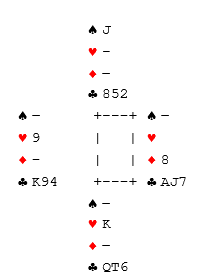 Idet ruter 8 spilles må syd enten kaste hjerter konge, eller gi opp en kløver. Hvis han kaster hjerter, tar spillefører de tre siste med A-K i kløver og hjerter 9. Syd ser han må holde hjerteren, og bør klare å kaste en kløver uten å avsløre seg. Men om spillefører leser sitsen kan han spille kløveren fra topp, og damen kommer på. Kløver knekt gir det tolvte stikket!