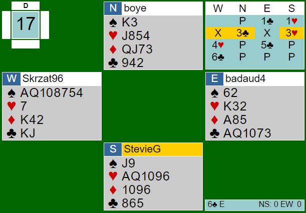 Øst åpnet med 1 kløver og Lindqvist meldte inn 1 hjerter. På ett-trinnet utenfor sonen synes jeg 1 hjerter er ganske opplagt innmelding, men overraskende nok passet noen på syds plass. Vest måtte etter deres system doble for å vise minst fire spar, og det var Brogeland sin tur. Han hadde firekorts hjerterstøtte, og det ville han vise makkeren sin, for syd kan jo ha gode kort og. Dessuten gjør et hopp det vanskeligere for motparten. Merk at vest ikke har fått vist noe særlig om hva slags hånd han har. Hoppet til 3 kløver viste ca. 6-9 med firekorts hjerterstøtte. Etter dette ble det gjettverk for Ø/V. Som eneste par i turneringen havnet de i 6 kløver. Det var hardt, men ikke en slem uten sjanser. Siden sparfinessen røk ble det en bet og 11 IMP til det norske paret. Alle de andre Ø/V-parene spilte utgangen 4 spar.