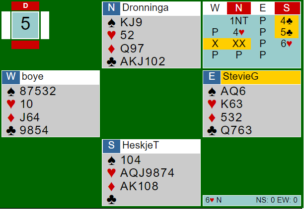 Jo, det er helt minimum, men her er det rett og slett for ufyselig å åpne med 1 hjerter siden det er så enormt stor forskjell i fargekvalitet. Omtrent over alt ble det da også åpnet med 1 kløver på søndag. Slik så hele spillet ut: