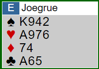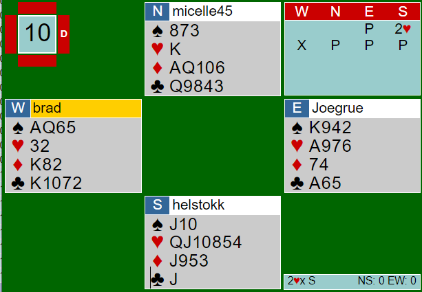 Det gikk pass rundt, og Ø/V var i frivillig meldt utgang med 19 hp til sammen. Men honnørpoeng betyr ikke alt i bridge, resultatet på et spill avhenger ikke av HP, men antall stikk som blir vunnet!