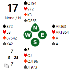 Det ble "gambling" samme hva som ble meldt, og jeg satset på at han hadde bare møl og sa pass. Det som tippet i favør av en pessimistisk sats var at med noen verdier som passer til fargene mine kunne han kanskje meldt 4 ruter over 3 spar.