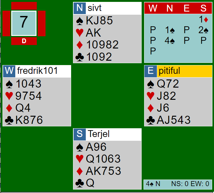 Men altså, da vet ikke nord sikkert om det er åttekorts tilpasning i majorfargen. Siv Thoresen (nord) gjorde det enkelt, hun meldte utgang direkte – 4 spar!
