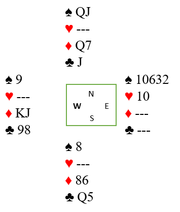 De fire første stikkene gikk akkurat likt ved begge bord. Vest skiftet til hjerter 9 som ble lasjert, så mer hjerter til damen og kongen fulgt av en tredje runde hjerter. Nå har spillefører to mulige måter å vinne ni stikk på. Han kan stikke over kløver knekt med damen og spille ruter mot damen. Det går bra siden han med ruter konge ikke har den siste hjerteren. Har han det blir det bet på den måten, og kanskje ville spillefører så oppdage at kløveren faktisk satt 3-3 og det kunne blitt ni stikk med fire stikk i kløver.