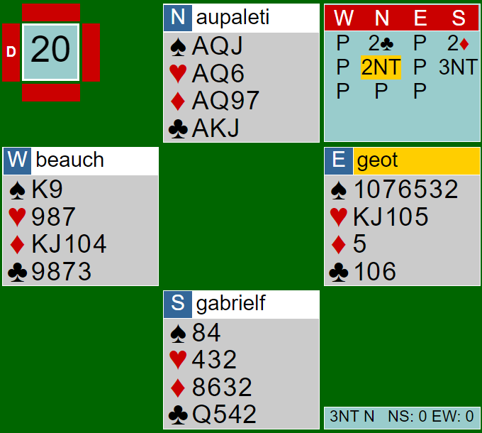 Mot 3NT spiller øst ut spar til kongen og esset. Når en ser alle kortene er det bare å ta en ruterfinesse så er det ni stikk siden ruter dame i så fall gir stikk. For å få til det må imidlertid kløver knekt stikkes over med damen som ikke er så artig om fargen sitter 4-2 eller 5-1. Noen spillefører mente de hadde tid til å godspille ruterstikk ved å starte med ruter fra hånden.