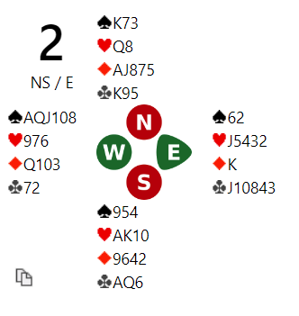 Utspillet og sluttkontrakta var den samme ved flere bord. Ved to bord med denne innledningen vant de med esset i bordet og spilte seg hjem på kløver. Så spilte de hjerter-9 til kutt og ny hjerter til knekten. Først nå begynner de med å etablere kløveren, men det er for sent. 4 hj gikk både én og to beter, litt avhengig av motspill og videre spilleføring.
