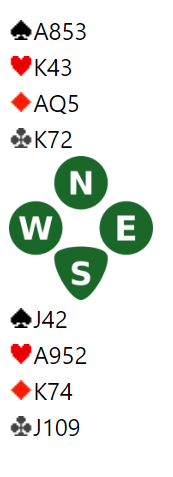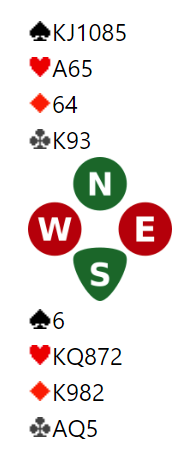Knut Molander (N) åpnet med 1 ruter siden de brukte grand 10-12 hp utenfor faresone og Rene Eriksen (Syd) hadde ikke noe godt bud i farge og valgte derfor svar 2 kløver som egentlig viser 5+ farge men som her var nød- bud og minst rundekrav. Med 15 HP valgte da Knut å hoppe til 3 NT og nå gjorde Rene kort prosess ved løft til 6 grand. De fleste ellers åpnet nok i Nord med 1 NT (jevn 15-17 hp) og av 19 bord kom 10 i 6 NT. Normalt kom kl 10 ut og du ser sikkert at her må du løse de røde fargene uten taper. I ruter mangler du jo D10 femte og normalt må derfor den fargen spilles med ru A og mer mot bordet. Molander gjorde det, og etter kl D i 1. stikk kom ru A  i 2. runde ruter kom ru D på fra Øst og dermed var 4 stikk i ruter vunnet. I tillegg to sikre stikk i spar og tre i kløver så nå trenger man 3 stikk i hjerter uten å få taper der. Knut tåkela situasjonen litt ved å spille spar til K og Øst vant med esset og fortsatte med kl 9. Den løp til kongen og så ruter J der Øst sakte spar. På ru 9 la Vest hj 4 og Øst en spar til. Hvordan vil du nå spille hjerterfargen? Molander så at motparten vanskelig kan skjule kortene helt, men antok at Vest neppe ville sake hjerter fra Dxxx. Dermed spilte han hjerter hjem til esset og deretter hj J, ny liten fra Øst og så liten fra bordet. Vest var da utsolgt og 12 stikk vunnet. Øst hadde sp A93- hj D987- ru D7- kl 10985. Iwona Larssen klarte også å vinne 6 NT mens de 8 siste parene i 6 NT gikk bet, et par til og med to beter. Egentlig er det Vest som må unngå å sake hjerter, Øst vil jo ikke gjøre det. Da har Nord ikke gode indikasjoner på hvor hj D er. Vest så jo at Nord bare hadde  4- kort ruter, dermed ikke 4- kort kløver normalt, og da kunne kløver sakes av både Ø og V på 4. runde ruter.