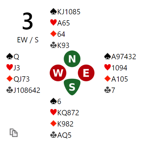 Ved bordene der motspillet startet med spar dame til kongen esset og mer spar kastet en rekke toppspillere på syds plass ruter. At de gjorde det er vel en indikasjon på at det er riktig spilt etter denne starten. Deretter klikket motspillet et par steder og kontrakten ble vunnet, men det ble bet der vest i tredje stikk spilte ruter til esset og øst spilte mer spar. Spillefører trumfet høyt i håp om at de gjenværende trumfene satt 2-2, men da fikk øst forfremmet 10-9-4 til trumfstikk – betestikket.