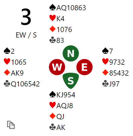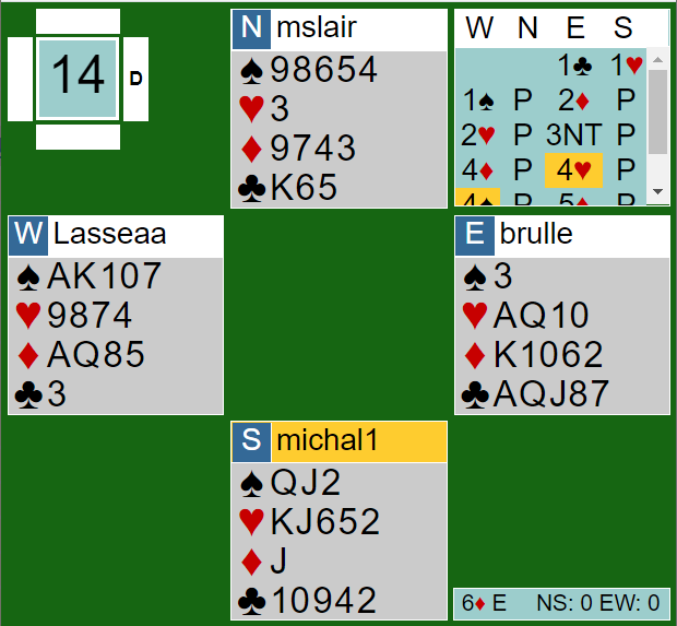 Han meldte 4NT - Key Card Blackwood og 6 spar da han fikk ett Key-Card fra nord. Uheldigvis var det vest som hadde det opplagte ruterutspillet, og da ble det raskt en bet. Ved det andre bordet stoppet N/S i 4 spar (også etter 1 spar i åpning).