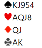 Martin Andresen (lag SKEIDAR) åpnet med 1 spar. Da fikk Chirster Kristoffersen et problem med nords kort. Han vil selvsagt i utgang. Men han er på et vis for sterk til å melde 4 spar direkte da det ikke bør være med en så god hånd. Hvis det er for stor "range" for det direkte svarhoppet til 4 i åpnerens majorfarge blir det umulig for åpneren å vite hva han skal gjøre med sterke kort. Hvis "rangen" er vid for slike meldinger blir det gjettverk. Går åpneren videre har kanskje svarhånden nesten ingenting, kun fem-seks spar og bra fordeling, og det kanvære bet på femtrinnet allerede. Hvis åpneren passer på 4 spar har kanskje svarhånden noen bra verdier, og en god slem kan bli misset.