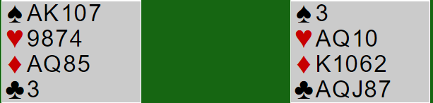 Ved det andre bordet kom N/S i 6 spar med nord som spillefører. Da ruterutspillet ikke ble funnet var det tolv enkle stikk, to ruter forsvant fra nord på syds hjerter.