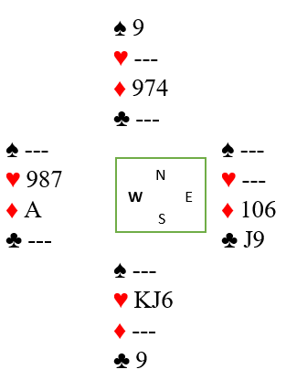 Øst skal spille 6 ruter etter at syd har meldt inn 1 hjerter over østs åpning 1 kløver. Syd spiller ut ruter knekt.