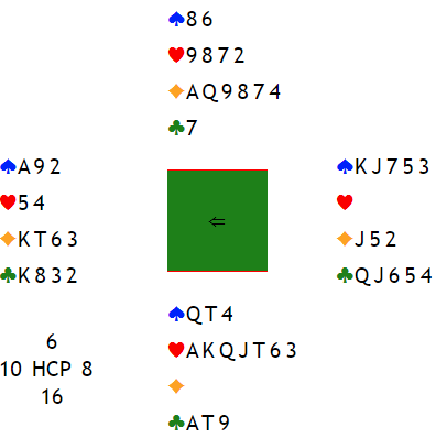 Ved det andre bordet havnet syd i 5 hjerter etter at øst hadde åpnet tynt i tredje hånd, og det førte til at vest doblet kontrakten. Vest spilte ut spar ess og Ø/V tok de to første stikkene, men resten fikk spillefører, +850 til N/S.