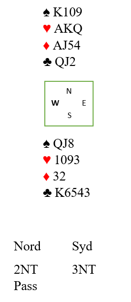 Først er du plassert som vest og skal spille 3NT. Noen vil kanskje melde 2NT som øst over svaret 1NT, men uansett kommer Ø/V i 3NT, og nord spiller ut kløver 7, fjerde høyeste.