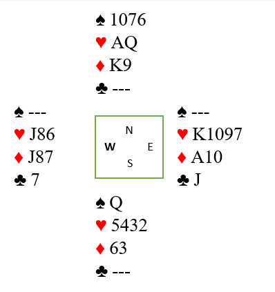 Nords ruter 9 er et gullkort som gjør at vest kan holdes helt ute av spillet. For nå spilles simpelthen ruter, og vests kort dekkes billigst mulig. Hvis han legger på knekten (som han neppe gjør) spilles kongen fra nord. Øst vinner med esset og kan ta for ruter 10, men så må han spille hjerter rett opp i saksen, eller til dobbeltrenons som trumfes hos syd mens hjerter dame forsvinner fra nord. Fem trekk.