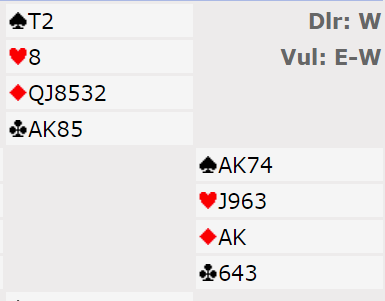 Åpningen var Multi, svake 2 i major eller en 20-21 grandhånd. Jan sin dobling viste ruterstyrke og min 2 NT var krav, jeg vet vi skal minst i utgang og Jan meldte 4 ruter « for det er det jeg har»- stilI gunstig sone kan det lønne seg om 7 stikk kan skrapes sammen. Nå hadde trolig Tormod lite bortkastet i ruter så jeg sjanset på 6 spar. Rundt til Johannesen igjen og tre trekk høyere, men skitt la gå og 7 ruter kom opp. Tre ekstra bet vil her koste 900 ekstra, men 500+ 900 er jo billigere enn 1430 hvis 6 spar står er logikken. Og det stemte siden Eva hadde enorm støtte i form av 4 kort ruter og en kløverfarge som matchet Jan sin hullete trekort «sidefarge». Alt vi fikk var 2 stikk i hjerter, 1 i spar og 1 i ruter. Da Tormod bare hadde singelton i kløver var 6 spar ikke til å rokke, men 7 ruter altså «god stamp», men det var mot en lilleslem som neppe blir meldt uten Jan sine sperreforsøk.