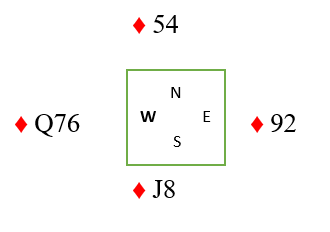 Molander spilte ut sp K, bordet vant og Wronski tok ut trumfen i 3 runder fordi Øst hadde tre. Fra hånden kom så kløver til A, så kl K og ny kløver til stjeling.På 3. runde sakte Molander en spar. Trolig hadde Øst nå vist 6-3-2-2 i fordeling. Hvordan spille ruteren for max en taper? Umulig å vite poengfordelingen imot, men Øst hadde sperreåpnet i faresonen. Hva ville du gjort?