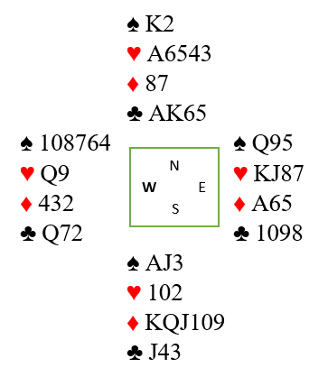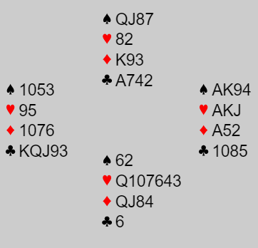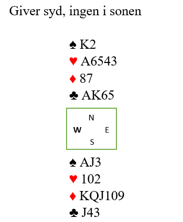 Syd fant et godt utspill da han unngikk hjerterutspillet og sendte i vei ruter 4. Nord la nieren og øst lasjerte. Etter den starten burde kanskje nord ha fortsatt med ruter, men han skiftet til hjerter til østs ess.