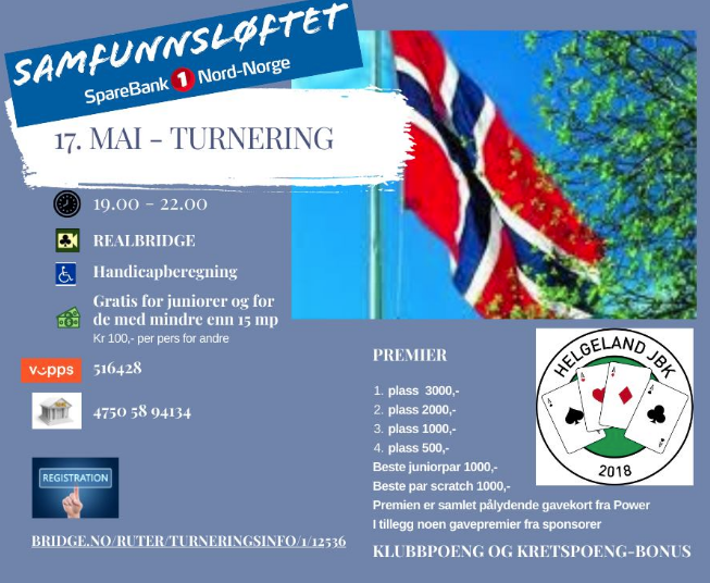 Helgeland Juniorbridgeklubb arrangerte bridge på selveste 17.mai. Turneringen ble spilt på RealBridge på kvelden etter at de viktigste aktivitetene på nasjonaldagen var unnagjort. Det ble en stor suksess, og hele 74 par deltok! Turneringen fikk dessuten et nesten utrolig ungt vinnerpar, til sammen er de 22 år!