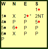 Som nord hadde jeg en vanskelig meldeprøve etter 4 spar – pass – pass. Dobler er take-out betont så det er klart et alternativ og kan bli veldig bra. Det var det som skjedde ved det andre bordet. Syd endte der i 5 ruter doblet av syd. Det lå og vippet mellom 500 og 800, men det ble fire doblede da vest mot slutten fikk en uppercut i trumf for åtteren, +800 til vårt Ø/V-par.