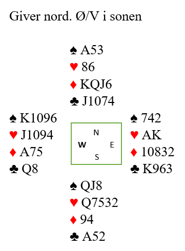 Om nord kaster ruter knekt idet øst tar for hjerter ess spiller øst sin siste ruter til nord som må spille unna J-7 i kløver til østs K-9. Hvis nord i stedet kaster kløver innkasserer simpelthen øst to kløverstikk, også da to sonebet og + 200 til ØV. Med pass rundt ved det andre bordet kostet denne gangen den tynne åpningsmeldingen 5 IMP.