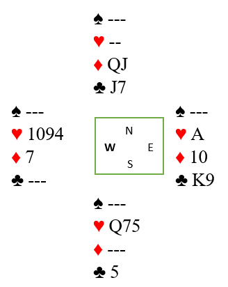 Spillefører har fått fire stikk og har to stikk på hånden. Så det ser ut til å kunne bli en bet. Men nå innkasserer øst hjerter ess, og nord har ikke noe godt avkast. Det oppstår et såkalt skvis-innspill i motspill for den andre beten!