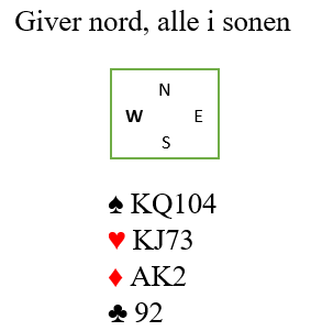 Solli satset med ruter til damen og kløver til stjeling. Så kom hjerter til røff og siste kløver til stjeling med trumf knekten. Øst bidro med liten og Vest hadde hj J. hvordan få returnert til hånden uten at opps kan få en eller annen høyning i trumf? Terje vurderte sjansene, er hjerter best eller kanskje ru A og så stjele ruter i håp om 3-3 der eller lengde i Øst.Terje landet på ruter, tok ru A og spilte ny ruter og gjedelig var Vest utsolgt på 3. runde og da holdt det med lav stjeling. Bare mulig taper i trumf, sp A ble lagt ned, og som bestilt kom sp Kpå fra Øst. Vest kunne dermed ikke få stikk for sp 963 og 11 stikk ble vunnet for 78,6% score. Øst hadde sp K- hj A72- ru J532- kl ADJ103