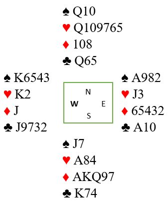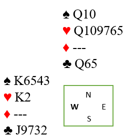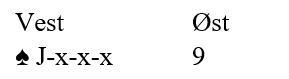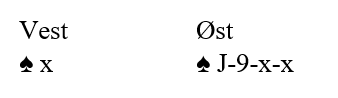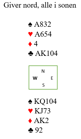 Er trumfen ikke verre enn 3-1 imot er kontrakten sikker men hvordan spille sparfargen? Nord dro selvsagt først trumf til A og K men Vest hadde hj DJ4 så der var det taper. For å sjekke sitsen stjal Nord kløver, dro ruter til kongen og stjal siste kløver også. Og deretter ruter dame og ny til esset som Vest stjal og slo opp igjen kløver til stjeling. Siste ruter ble spilt til bordet og spar derfra. Enig?