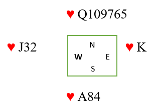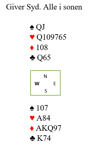 I siste spill fikk Syd prøve seg. Øst -Vest passet men Syd åpnet med 1 ruter og over 1 hjerter fra Nord kom hopp direkte til 4 hjerter fra åpner. Kl A ut fra Terje men Nord var renons og stjal. Legg plan videre.