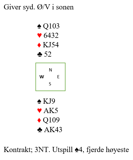 Spar 9 tok altså første stikk. Så ruter dame som vant stikk, ruter 10 som også spillefører fikk beholde for, og øst vant for ruter ess i fargens tredje runde. Øst spiller spar. Syd har da KJ og nord Q10. Hvis syd legger spar konge ligger vest unna. Da vinner kongen stikk og med singel knekt og damen singel hos nord finnes ikke inntak, vest har jo igjen esset. Og med kun to ruterstikk i stedet for tre blir det en bet i utgangen. Hvis syd idet øst spiller spar forsøker knekten stikker vest med esset, og kongen blokker så det heller ikke da blir inntak til nord.