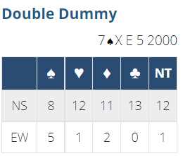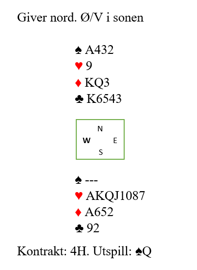 Hvis ruteren hadde vært fordelt 4-2 ville du i stedet kastet den fjerde ruteren som i så fall ikke kan gi stikk, så trumfes en spar før den (med slik rutersits) eneste sjansen for tolv stikk forsøkes, kløver til kongen: