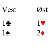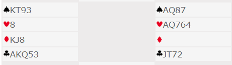 Du kan enten kaste en ruter, eller kvitte deg med en kløver. Hvis kløver ess sitter bak bør du kaste en kløver og håpe ruter sitter 3-3, i så fall blir det tolv stikk. Hvis derimot ruter sitter 4-2 og kløver ess foran må du kaste en ruter på spar ess. At ruter sittter 3-3 er 36% sjanse, og at kløver ess sitter foran er 50% sjanse. Følgelig bør du vel kaste en ruter på spar ess?