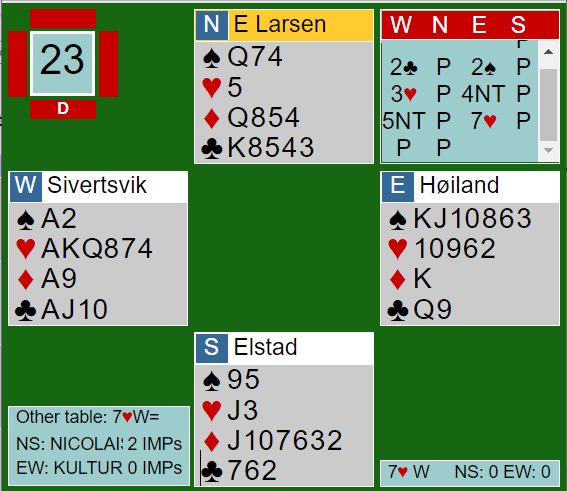 Øst sa 4 ruter som var kontrollmelding med støtte i hjerter. Ved det bordet var det vest som spurte med 4NT, og over svaret "0 nøkkelkort" sa vest 5NT som bekreftet at alle nøkkelkortene inkludert trumf dame var på plass (storeslemsinvitt). Det var nok for Evenstad som melde 7 hjerter. Han så at sparfargen måtte kunne gi uttelling, og slik var det. Pluss 2140 og uavgjort spill.