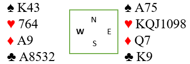 Øst kastet nå en ruter til og han så ganske optimistisk ut, så jeg trodde egentlig han hadde ruter ess og kløverstikkene sine. Men det så også ut som om vest hadde kastet en hjerter fra femkorts, helt sikkert ikke fra fire-korts hjerter med knekten. Så nå burde jeg sett den fine sluttposisjonen.