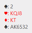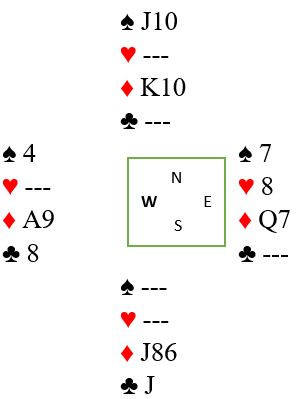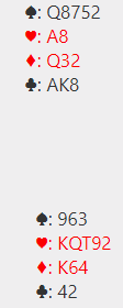 Hvis singel ruter konge singel beholdes i sluttposisjonen, og en hjerter forsvinner fra syd i stedet vil det se slik ut med fem kort igjen: