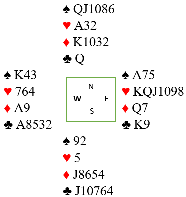 Hjerter ess spilles fulgt av hjerter til kongen, og i det stikket avsløres sitsen. Siden vest har ruter ess (singel) er det bare å spille ruter, og han må avslutte med hjerter fra J-7 til hjertersaksen Q-10 hos syd, ni stikk.