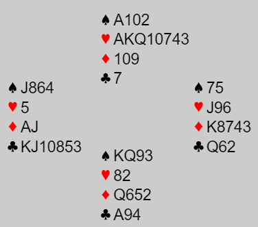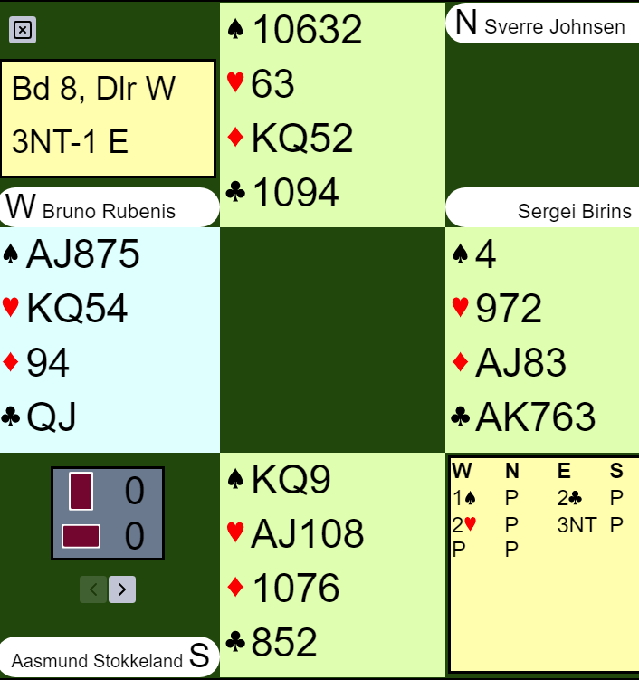 Lars Eide (øst) og fikk hjerter knekt ut fra syd. Han vant med en honnør hos vest og tok for dame-knekt i kløver før han spilte ruter. Nord la i en honnør, øst stakk. Så tok han simpelthen kløverstikkene og kastet spar og ruter fra vest. Så hjerter mot bordet, og han hadde like etter fått fatt i 1+2+1+5 = 9 stikk, +400 og 10 IMP til NORGE.