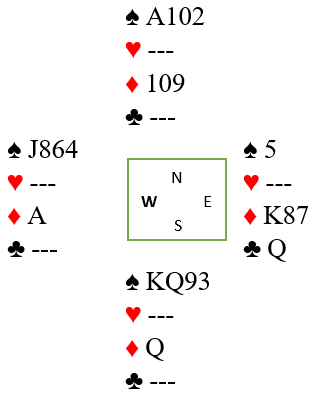 Etter kløverutspillet hadde spillefører elleve toppstikk, og det ville vært tolv enkle om det var fire sparstikk å hente. Kløver ess vant første stikk, og det ble spilt trumf. Om sparen sitter fint og gir fire stikk vil den gi fire stikk senere også, så det haster ikke med å prøve sparfargen. Meek dundret i vei med alle trumfene. Idet den siste trumfen var tatt så det slik ut: