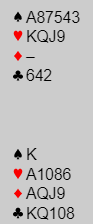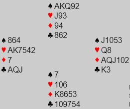 Dette var kveldens første spill. Som du greit kan se har N/S en glimrende lilleslem i hjerter med disse kortene. Selv om hjerter satt 4-1 var det ganske greit å vinne tolv stikk siden sparfargen kunne godspilles med kun en stjeling (satt 3-3). Å score +980 for 6 hjerter med tolv stikk ga imidlertid hele 90%, kun slått av en altfor ambisiøs stamp i 5 ruter av ett Ø/V-par. Det kostet -1100.