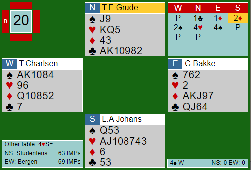 Nord hadde imidlertid ingen grunn til å spille ut spar, og han spilte ut ruter konge. Tundal vant med esset, tok to store trumf og spilte hjerter til damen. Da den holdt forsvant i neste stikk vest sin spar på hjerter ess, og forsvaret fikk kun ett stikk i ruter i tillegg til det ene trumfstikket de hadde krav på. Pluss 600 sammen med +100 for en bet i 4 spar var verd 12 IMP.