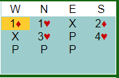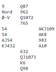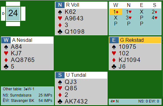 Og for vinnerlaget «tryllet» Bakke hjem 4 hjerter, dog med litt annen informasjon. Underveis hadde Ø/V meldt og støttet ruter, og over 3 hjerter foreslo vest 3NT.