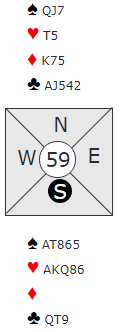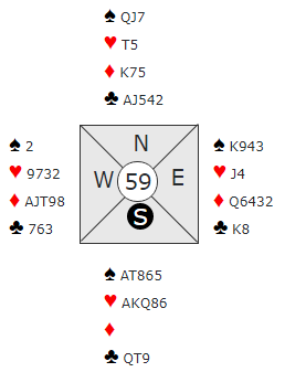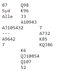 Å melde slem er heller ikke nødvendigvis så enkelt. Hvis syd åpner med 1 spar, har nord til en invitt med tre-korts støtte. Ja, det er faktisk en god invitthånd, nært innpå nok til utgang (11 HP pluss en dobbelton) mot en (minst) femkorts sparåpning. Det koker vel ned til hvor optimistisk syd er, og siden han ikke har første- eller andre rundes kontroll i kløver kan det bli vanskelig idet syd kontrollmelder ruter. Er det da så lett for nord å gå på forbi 4 spar? Hvis han i systemet deres kan si 4 hjerter – såkalt «last train» - for å vise en viss interesse (ikke nødvendigvis hjerterkontroll) og at det bekrefter kløverkontroll melder de kanskje slemmen. Men i så fall må den vinnes, og det er som sagt ikke så lett. Slik så hele spillet ut: