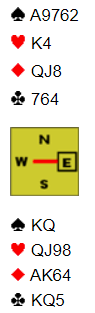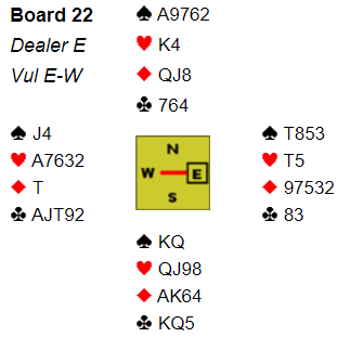 Men ett par vant 7 NT. Der åpnet Nod meed 2 kløver, Syd svarte 3 kløver og med spm om ess gikk Nord direkte i 7 NT. Der var ingenting av fordeling Norrd hadde avslørt. Følgen ble at på 4. runde hjerter måtte Veest velge å sake spar eller kløver, valgte det første siden deet ville være «molbo» å avsløre at kløveren ikke er i Vest. Så lite skal til for å snu tap til seier.